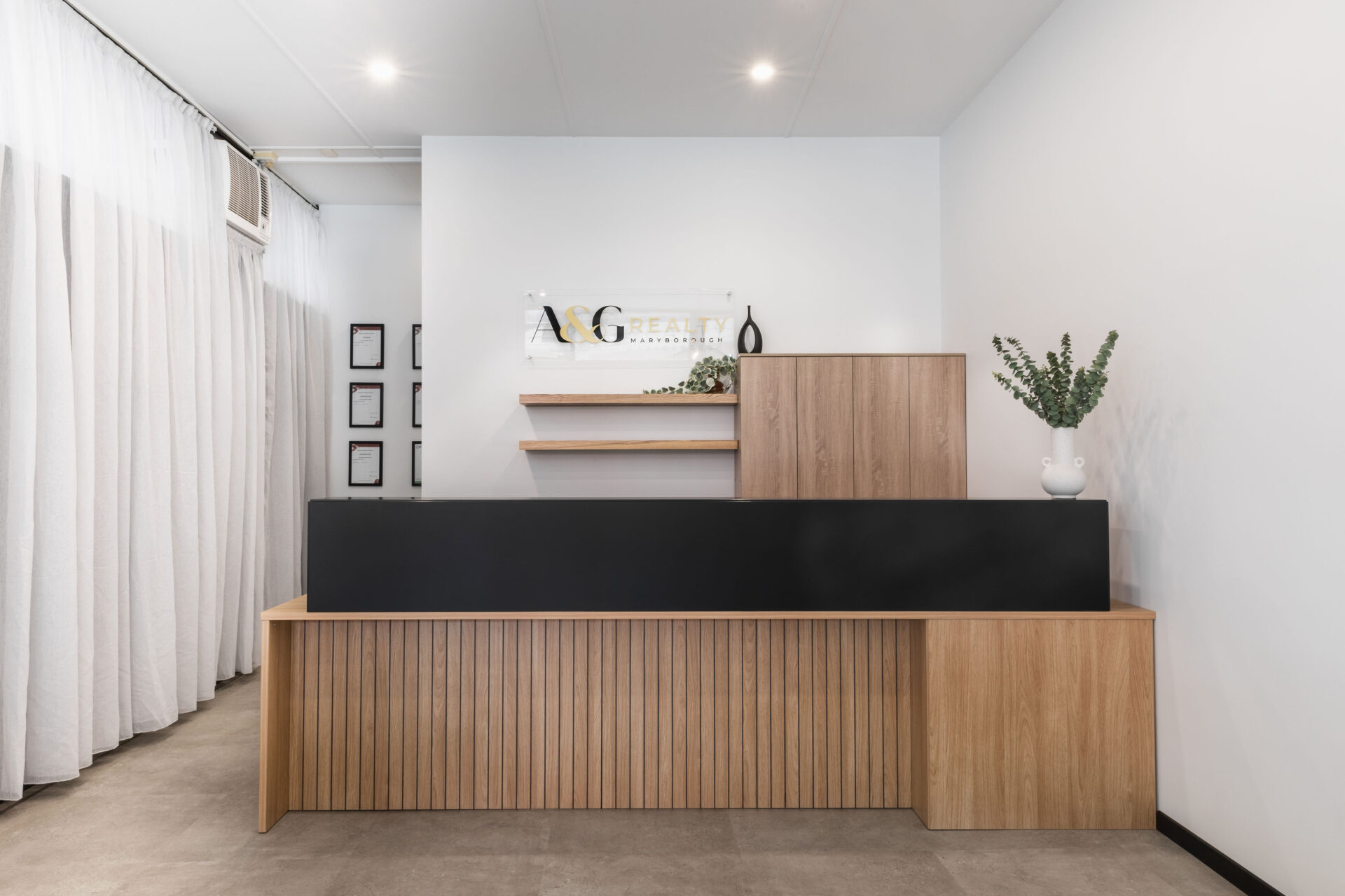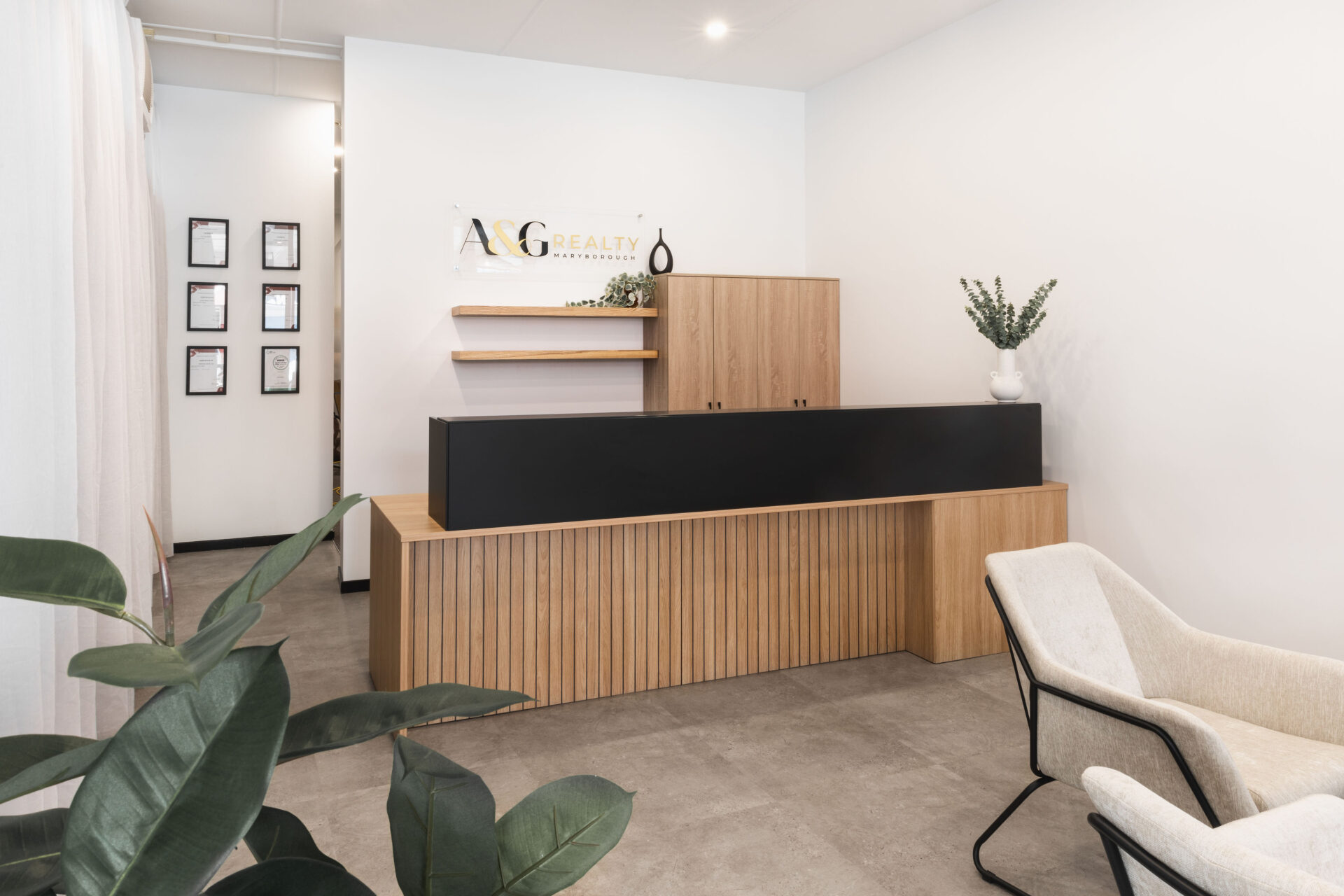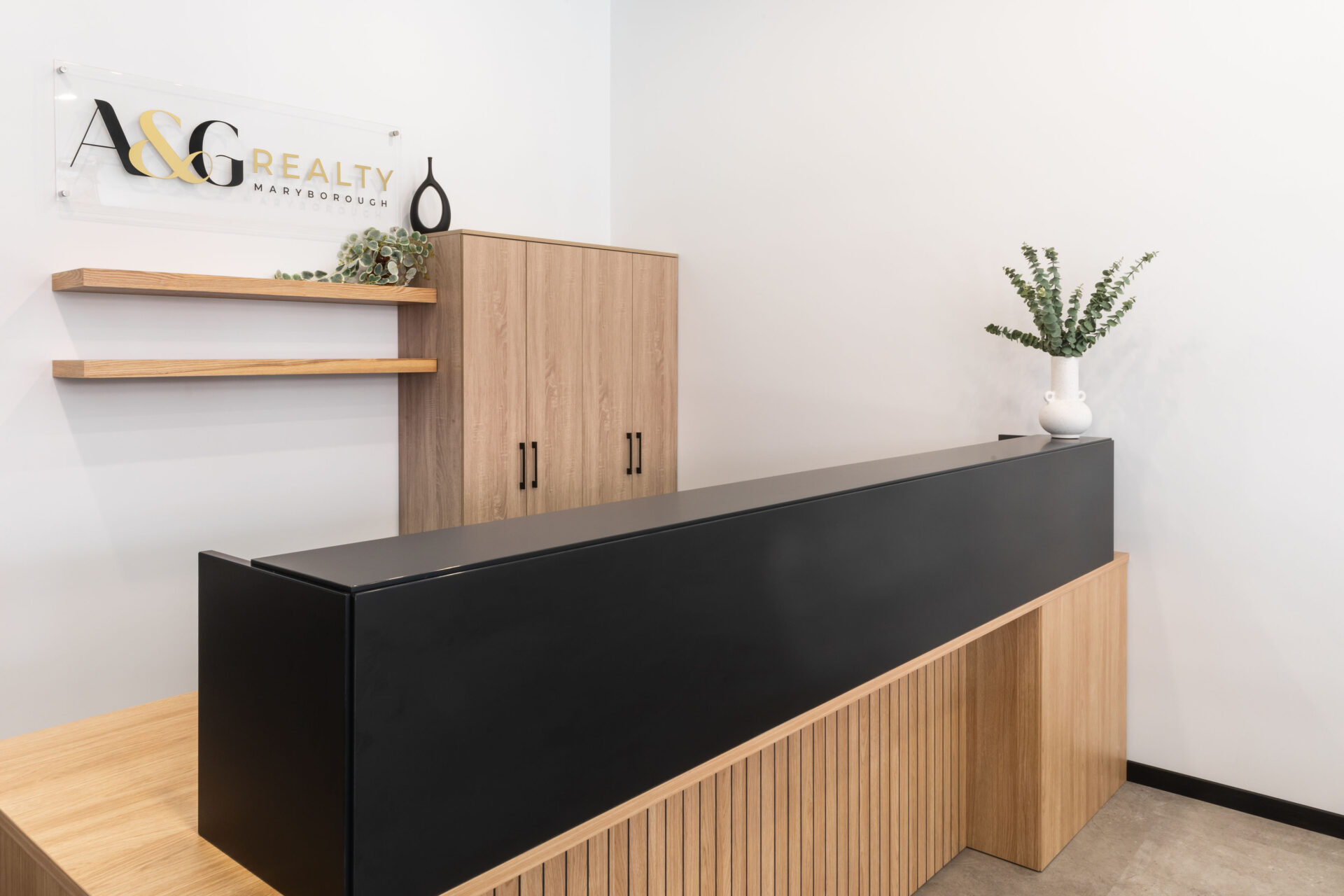 When A&G Realty Maryborough approached Total Fitouts Wide Bay, they were looking to transform their outdated and cramped reception area into a modern and inviting space that would make a great first impression on their real estate clients. With the help of the commercial design and shop fitting team, the antiquated space was transformed into a modern, fresh, and appealing workspace. The project was conceptually designed and managed by Warren Thorpe and the Wide Bay team from start to finish, the concept to completion commercial fit out experts.