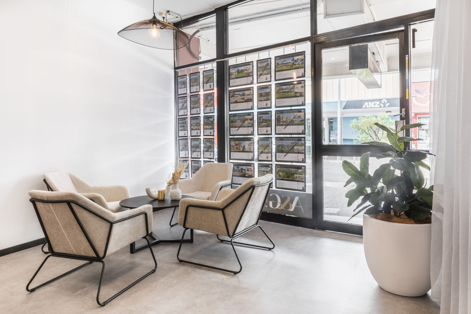 Read more: A & G RealtyIshoa says, “The project now has a natural, fresh feel to it, with bespoke wooden panelling, custom wooden shelves, and storage solutions. The addition of soft curtains, pendant lights, and bespoke signage create the welcoming and warm atmosphere and style the client desired. The street appeal was enhanced with fresh signage and interchangeable displays to showcase real estate properties.”