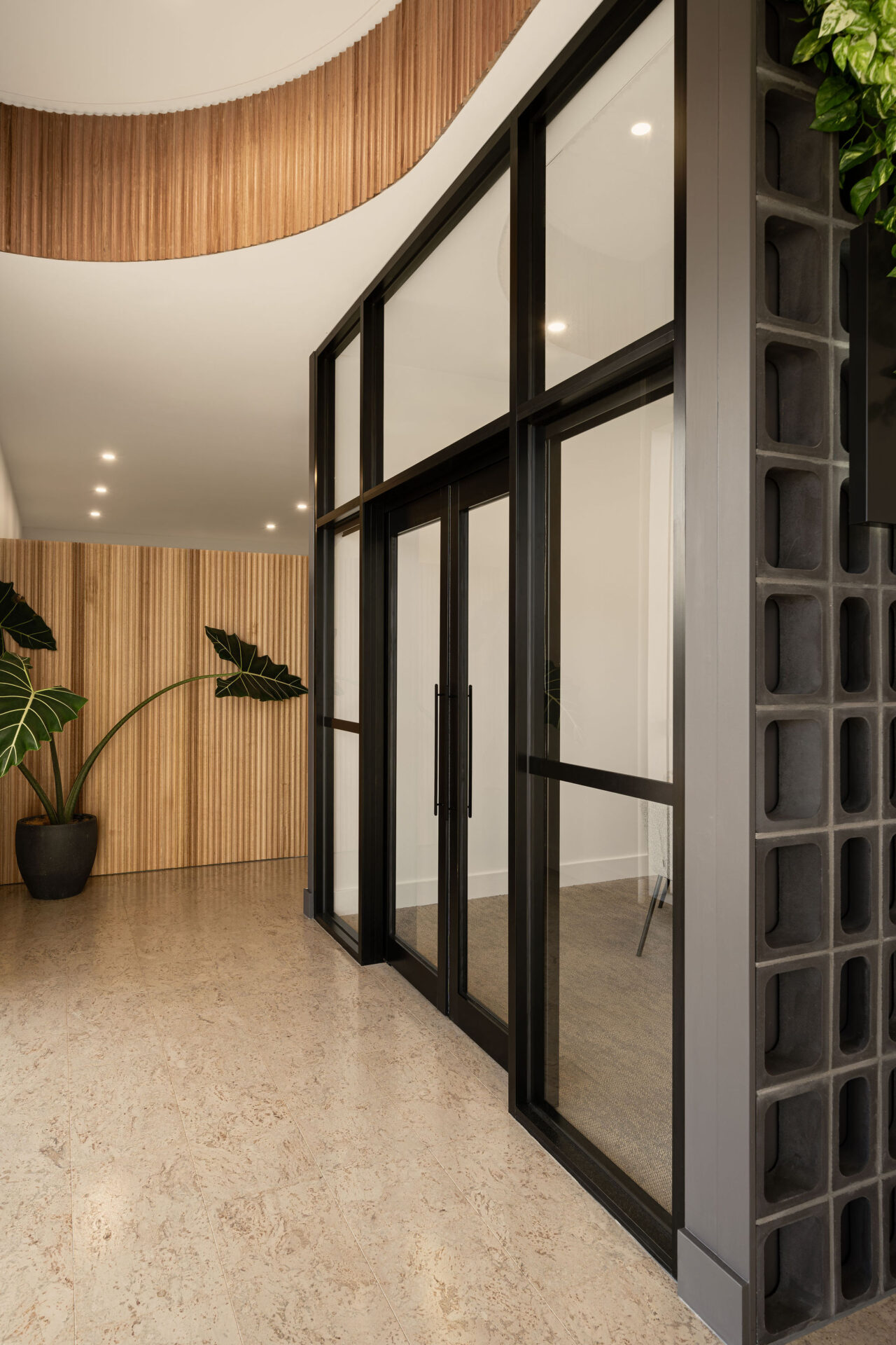 The commercial design was completed by the in-house design team at Total Fitouts Sunshine Coast South, who were responsible for the project’s design and execution. Ensuring every detail of the commercial office fitout was handled with precision, showcasing a modern and sophisticated aesthetic. The commercial fitout features a stunning ceiling with warm wooden slats and ambient lighting, adding an inviting and upscale touch.