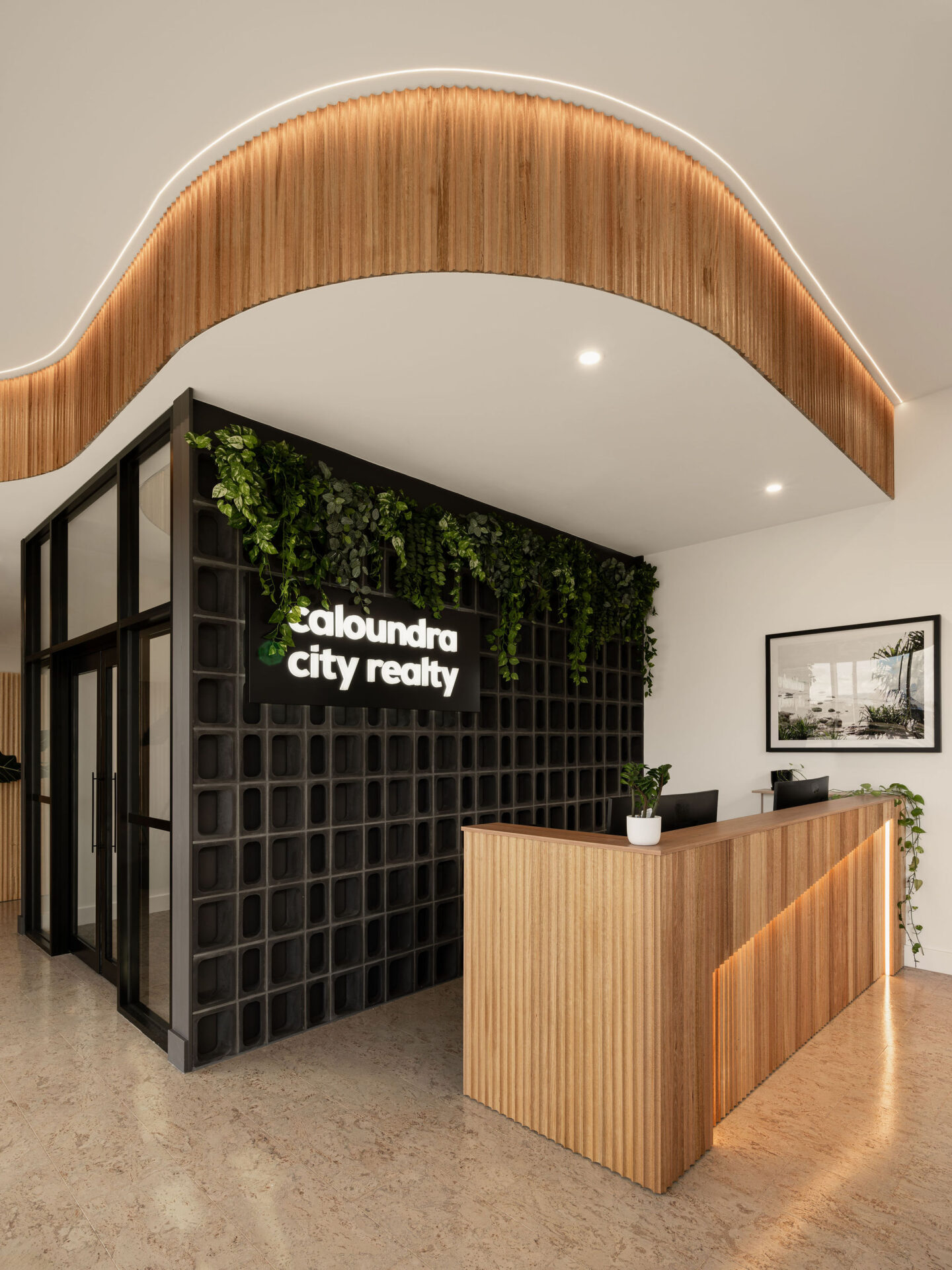 Read more: Caloundra City RealtyOne of the standout commercial design features was the feature breeze block wall, which added a distinctive architectural element to the office. The use of glazing in the boardroom helped to keep the space open, enhancing the overall work environment. Additionally, a curved bulkhead with LED strip lighting around the reception area added a modern touch, seamlessly blending form and function.