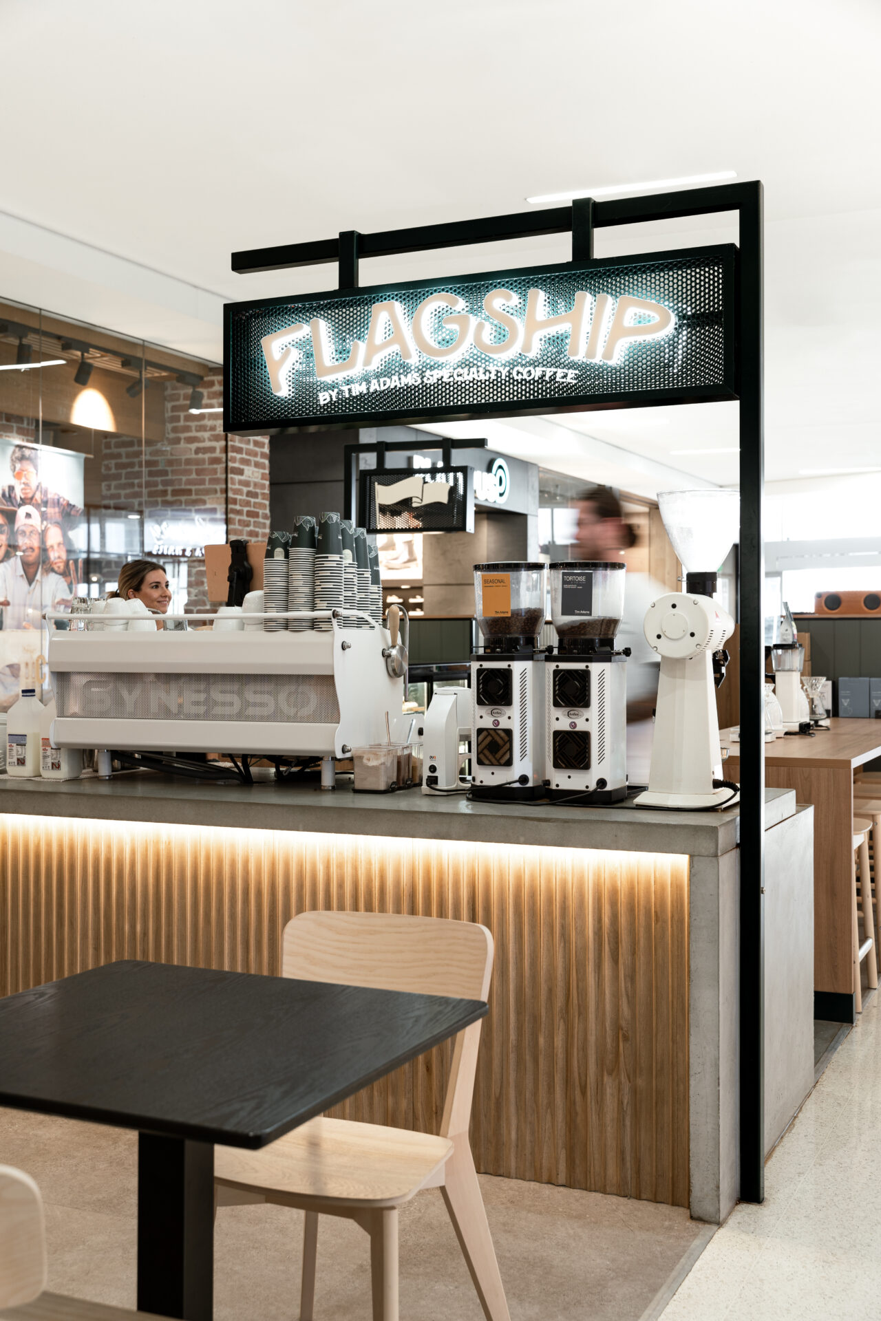 Tim Adams Specialty Coffee, the brainchild of award-winning Australian barista Tim Adams, approached the Total Fitouts Sunshine Coast South team to create their Flagship store within Kawana Shopping World. The talented team were tasked with creating a natural space that reflects the company’s sustainable ethos & ethically responsible products. Collectivus, a key collaborator in designing the project, helped achieve the retail fitout’s overall aesthetic, layout, and finishes.