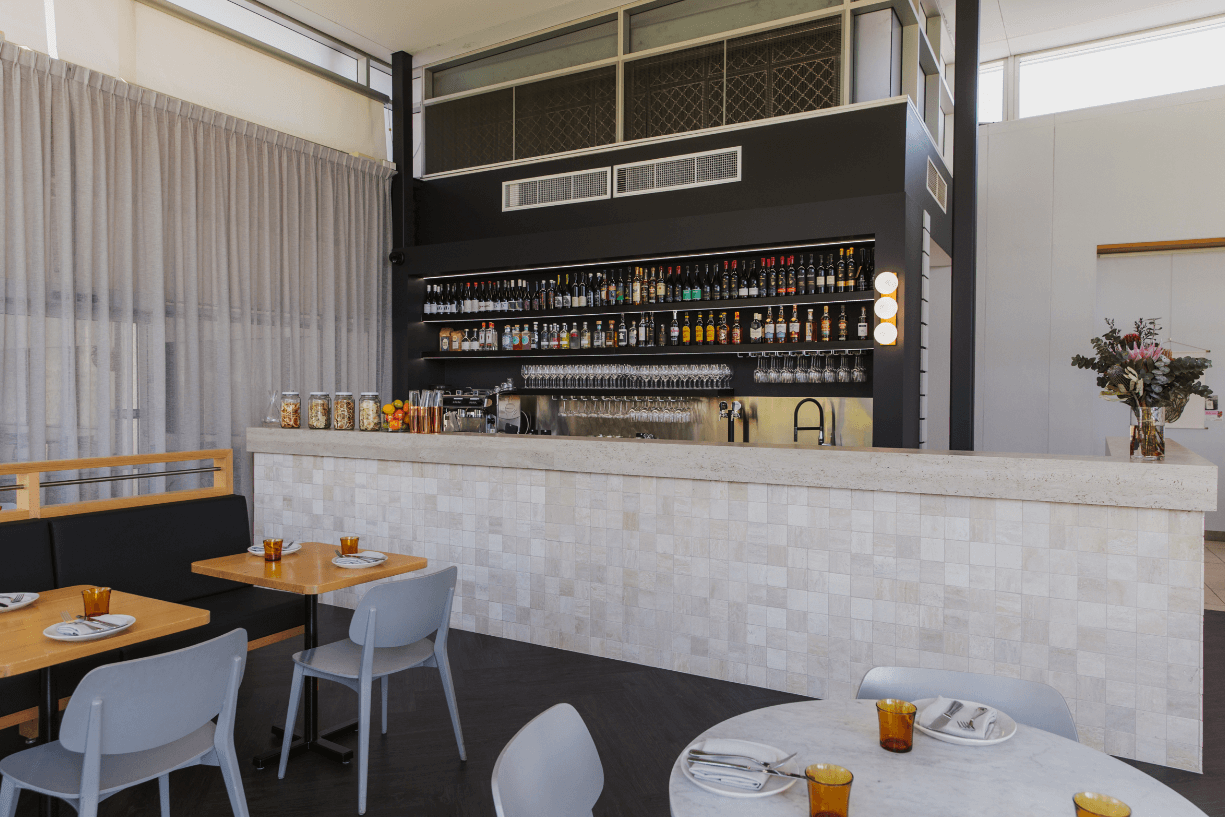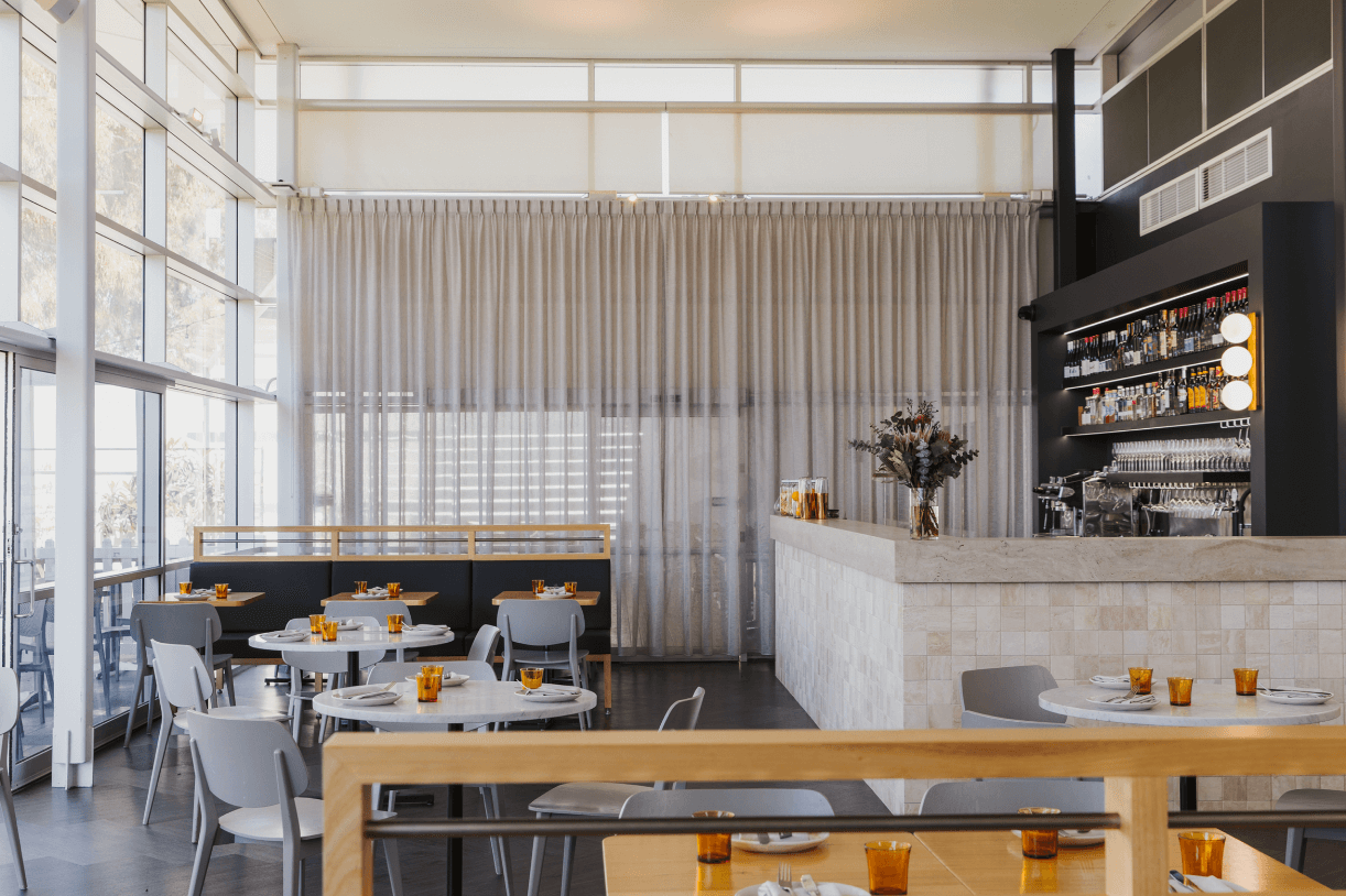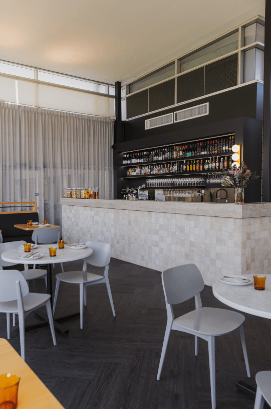 A distinguishing feature of the commercial design is the bold incorporation of robust black steel elements, artfully contrasting with the light timbers. This deliberate choice introduces an industrial edge to the design while preserving an air of sophistication, resulting in an inviting and harmonious space that appeals to a wide range of visitors. The open dining space with a luxurious counter area helps section off the build and create multiple multi-functional spaces. Dark timber herringbone flooring is featured along with beautiful square stone tiling along the counter to create cohesion with the neutral colours of the walls and make the other timber features pop. Sheer curtains are used in the space as well to make it feel more open and light.