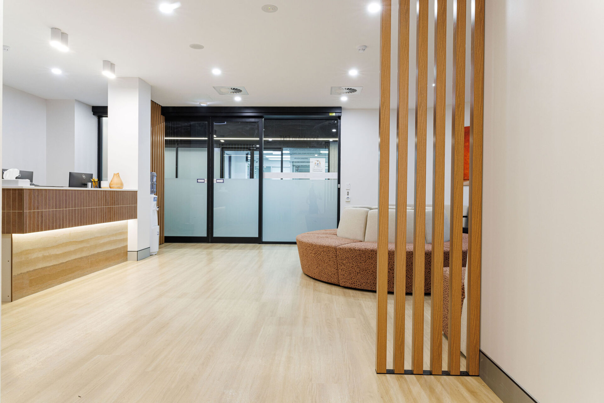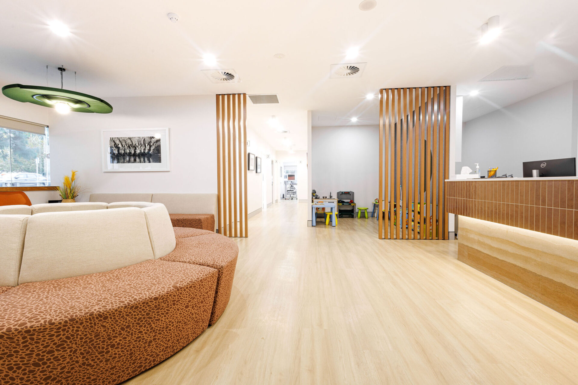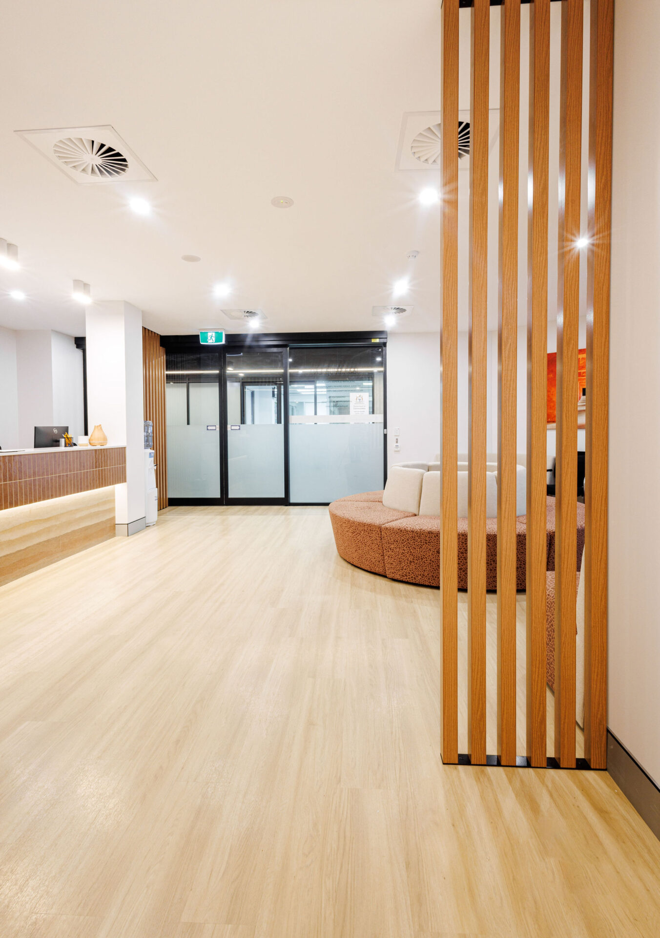 The space is characterised by its clean, contemporary lines and a professional yet welcoming ambience, designed to put patients at ease from the moment they step through the door. Upon entering the commercial fitout, patients are greeted by a spacious reception area, featuring rammed earth tiles at the counter that add a unique, earthy texture to the modern decor. This is complemented by custom-made Aboriginal booth seating, which not only provides comfort but also pays homage to local culture, creating a sense of place and connection.