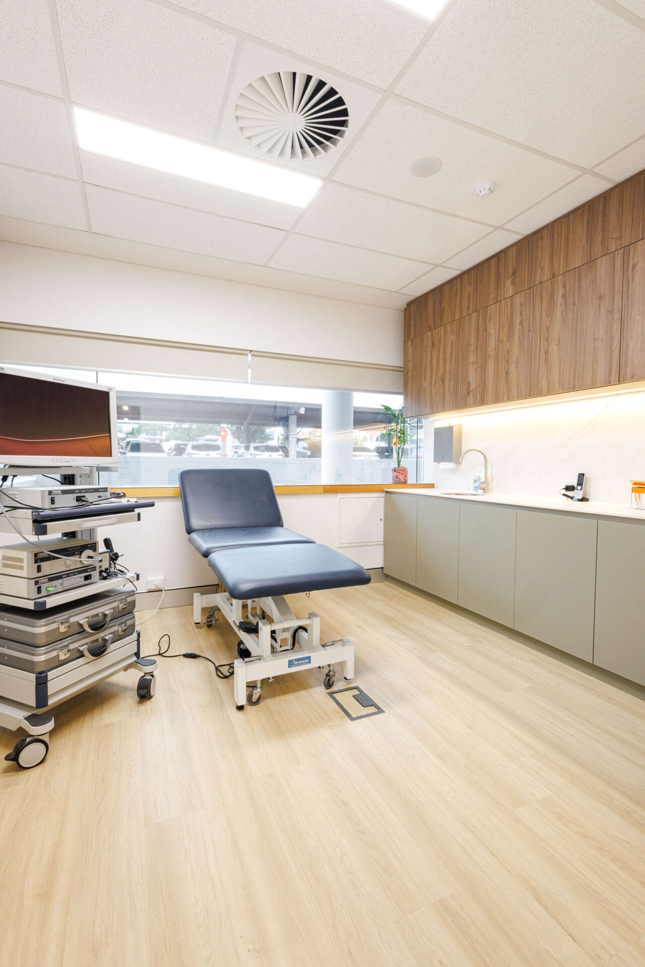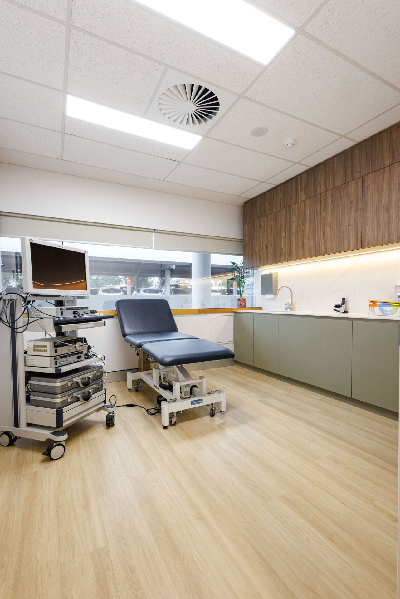 The waiting room of the commercial medical fitout is large and inviting, designed to be both functional and comfortable. Acoustic lighting is a standout feature, reducing noise levels and contributing to a calm and serene atmosphere. This thoughtful integration of lighting enhances the overall patient experience, ensuring a tranquil environment conducive to relaxation. The practice includes four consult rooms, each meticulously designed to facilitate detailed patient consultations. These rooms are equipped with state-of-the-art medical equipment and furnishings that prioritise both patient comfort and clinical efficiency. The commercial design of these spaces ensures that doctors can conduct their consultations effectively, with all necessary tools at their fingertips.