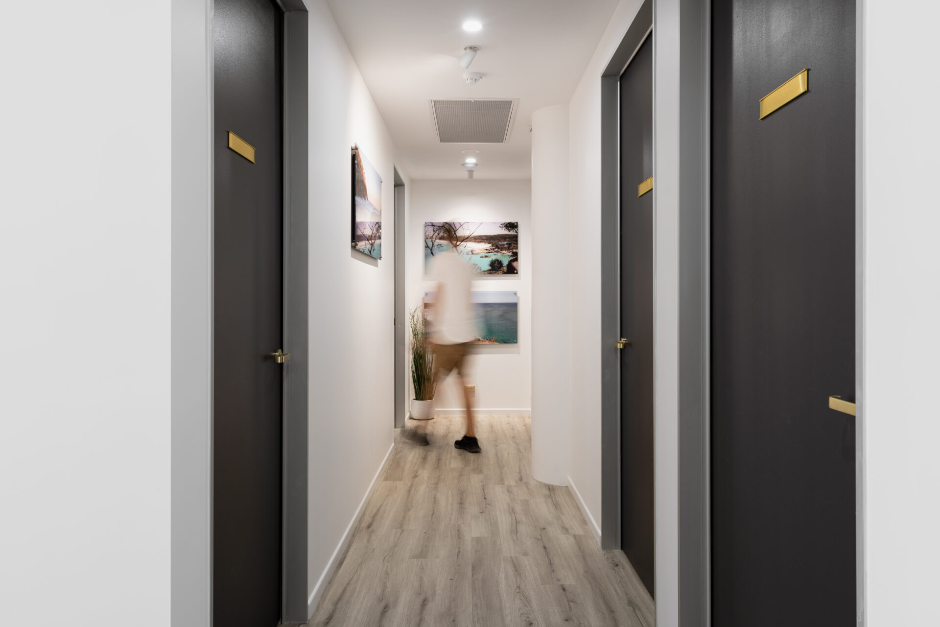 Other important design elements were the creation of 7 treatment rooms (big enough to incorporate chunky medical equipment), a welcoming reception area and a comfortable yet stylish waiting space. The always essential ‘patient privacy’ requirements were achieved with clever acoustic panelling, verdant plants, and bespoke hardwood screens. Neutral colours, timber, stone tops, copper accents and high-end render finishes allowed the traditionally sterile space to feel warm and inviting for patients.