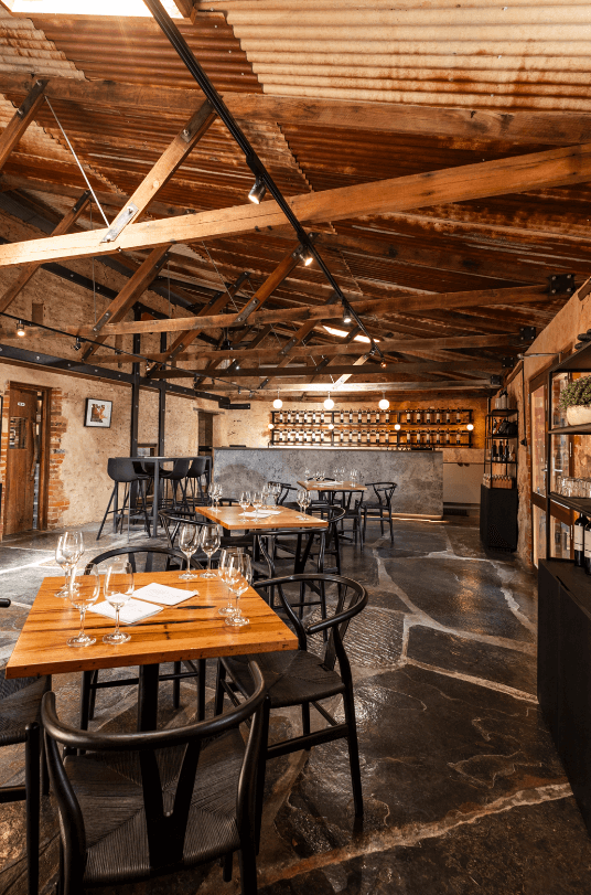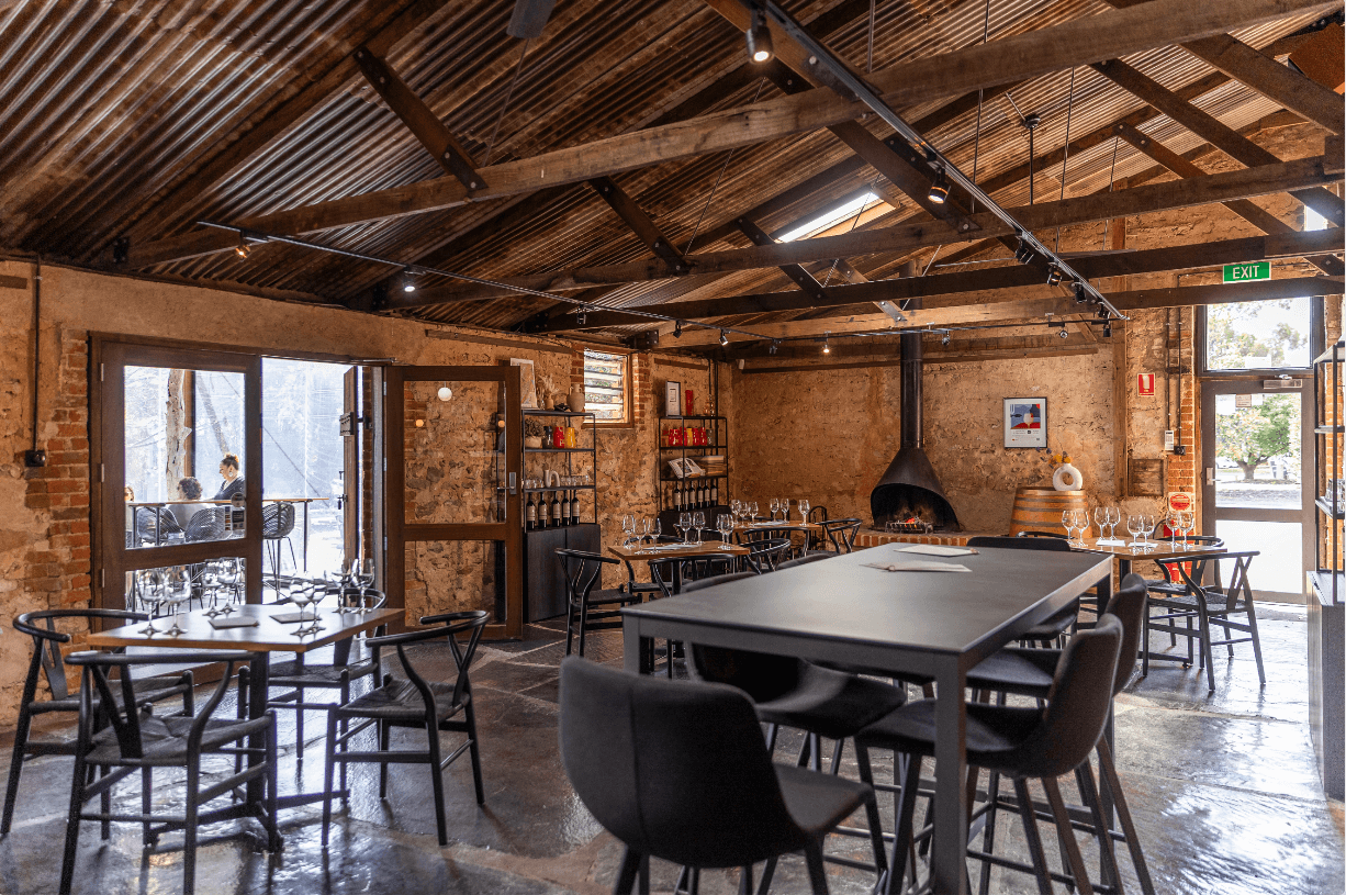 The entrance to the commercial shopfit sets the tone with a large timber doorway featuring glass panelling, inviting patrons into the winery’s world. Rustic charm abounds with exposed tin roof panelling and timber support beams, creating a structured yet welcoming atmosphere. Exposed brickwork and concrete walls further enhance the rustic, old-world ambience. A carefully chosen mix of sleek black tables with wooden tops, paired with black chairs, provides seating for guests. A central black fireplace and wine racks not only add to the aesthetic of the commercial hospitality fitout but also ties in with the winery’s theme. Large marbled stones on the ground break up the space and contribute to the overall design.