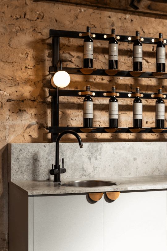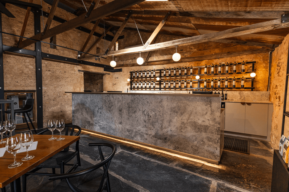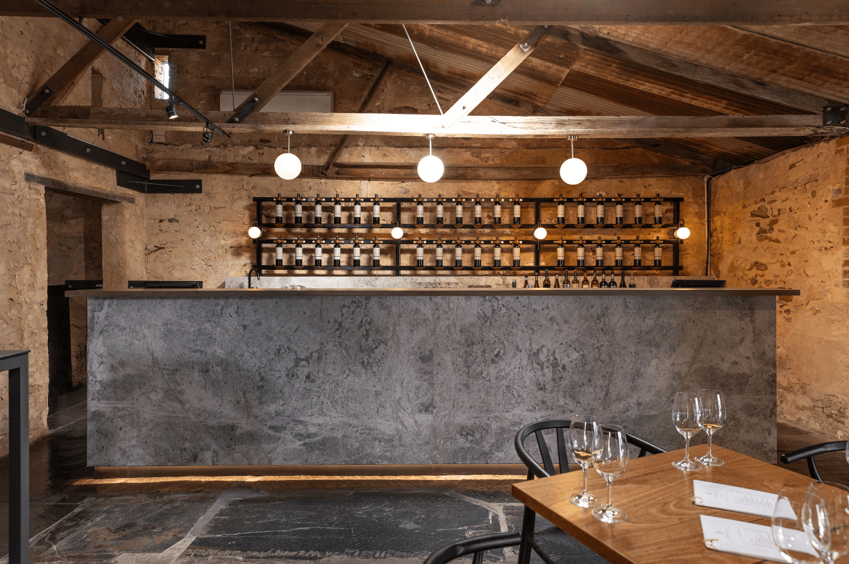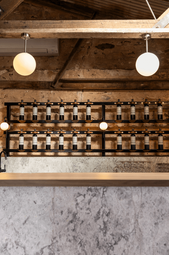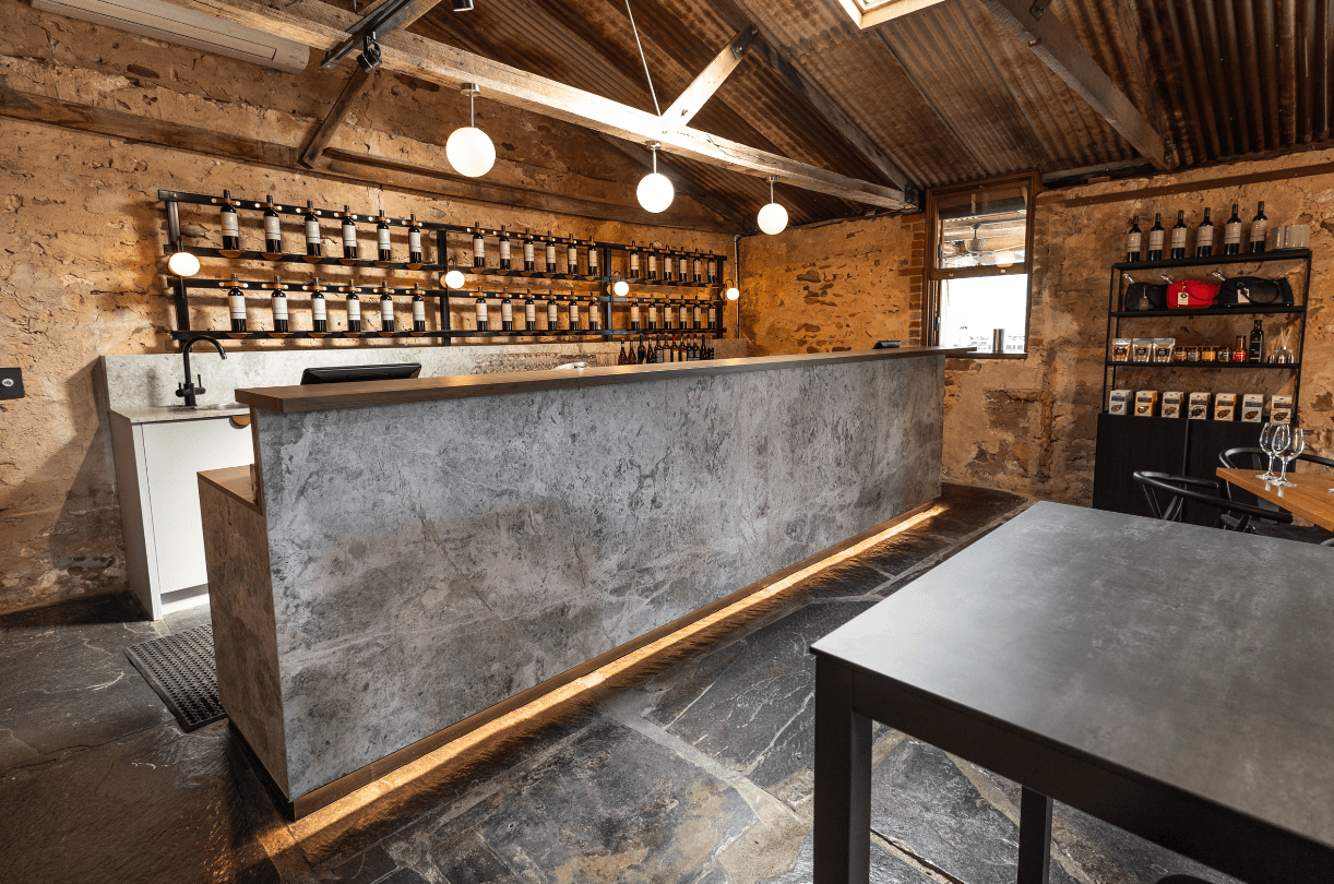 Read more: Shingleback WineryThe service area of the cellar door fitout is marked by a substantial marble counter, elegantly lit with concealed LED lighting underneath. This illumination enhances the functionality and adds to the visual appeal of the space. Aluminium cabinetry and black wine racks behind the counter provide storage and display options.
