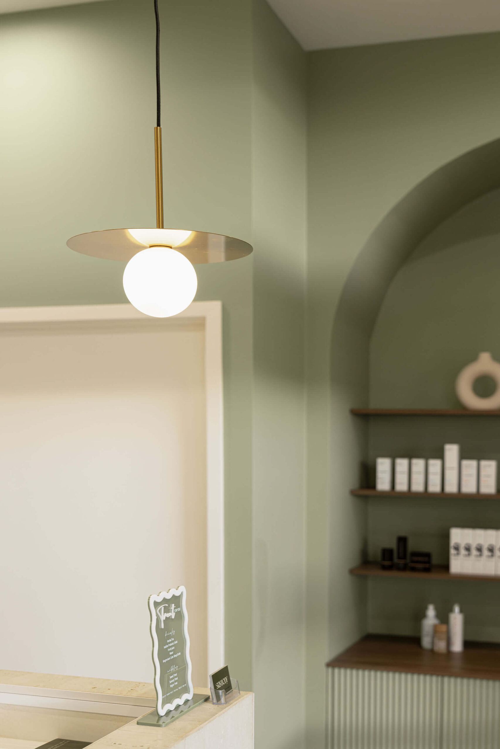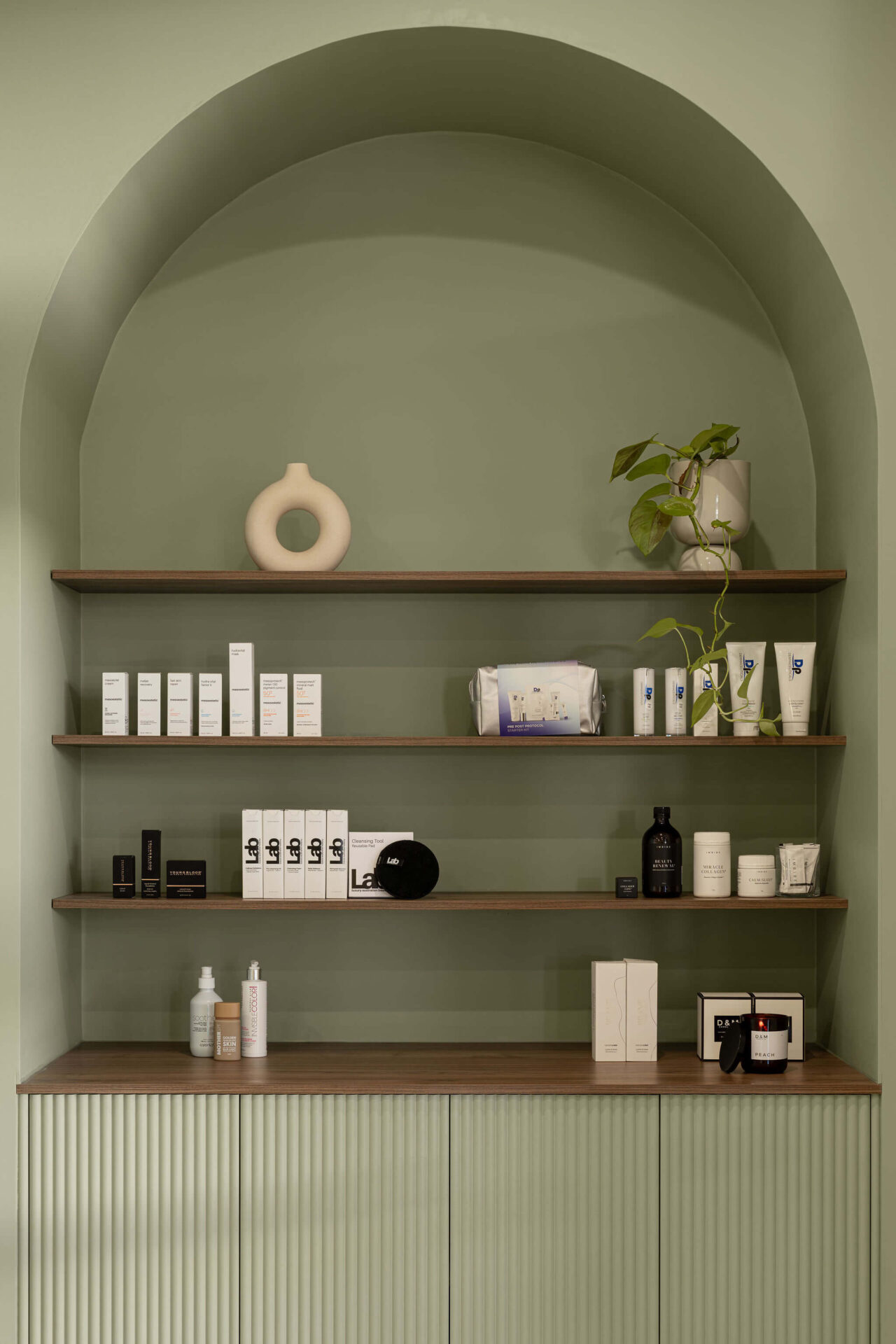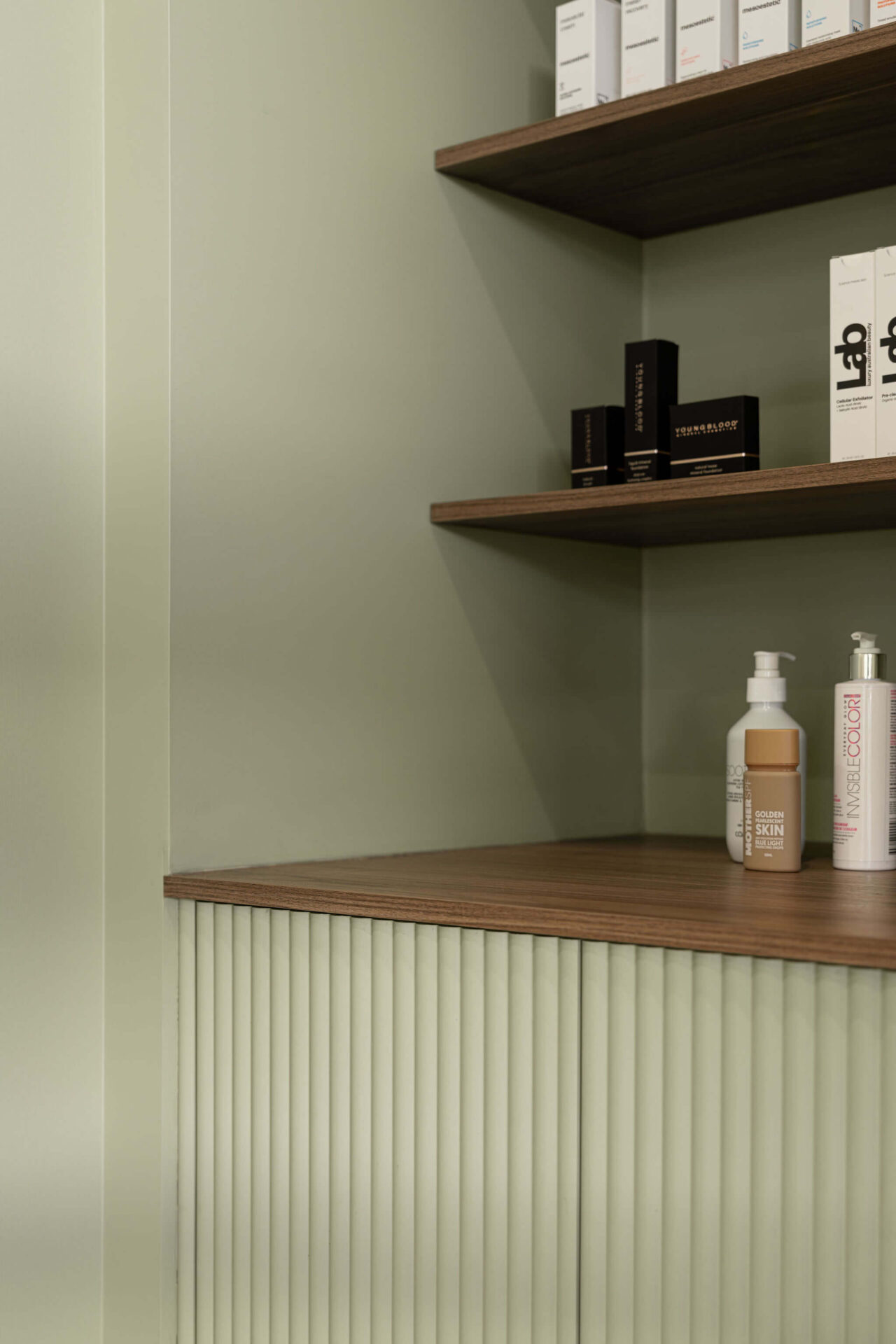 The commercial wellness & beauty fitout was strategically driven by the desire to expand the existing chemist in the area, resulting in a 90-square-meter space. Josie seamlessly incorporated key elements from her previous location, including the reception area, custom booth seating, built-in shelving, Otsiminyagi rendering (rockcote) from Arlo Stone & Finishes, custom wall niche shelving, travertine tiling for the reception desk from National Tiles, and vinyl tile flooring. The new establishment featured five treatment rooms, three LED bars for specific treatments, a dedicated tan room, and halo-lit brand signage out front, creating a welcoming and branded exterior. Natural green hues and darker timbers, particularly walnut woods, were chosen to evoke a unisex and organic ambience. Solid satin brass wavy handles from Lo & Co were also incorporated.
