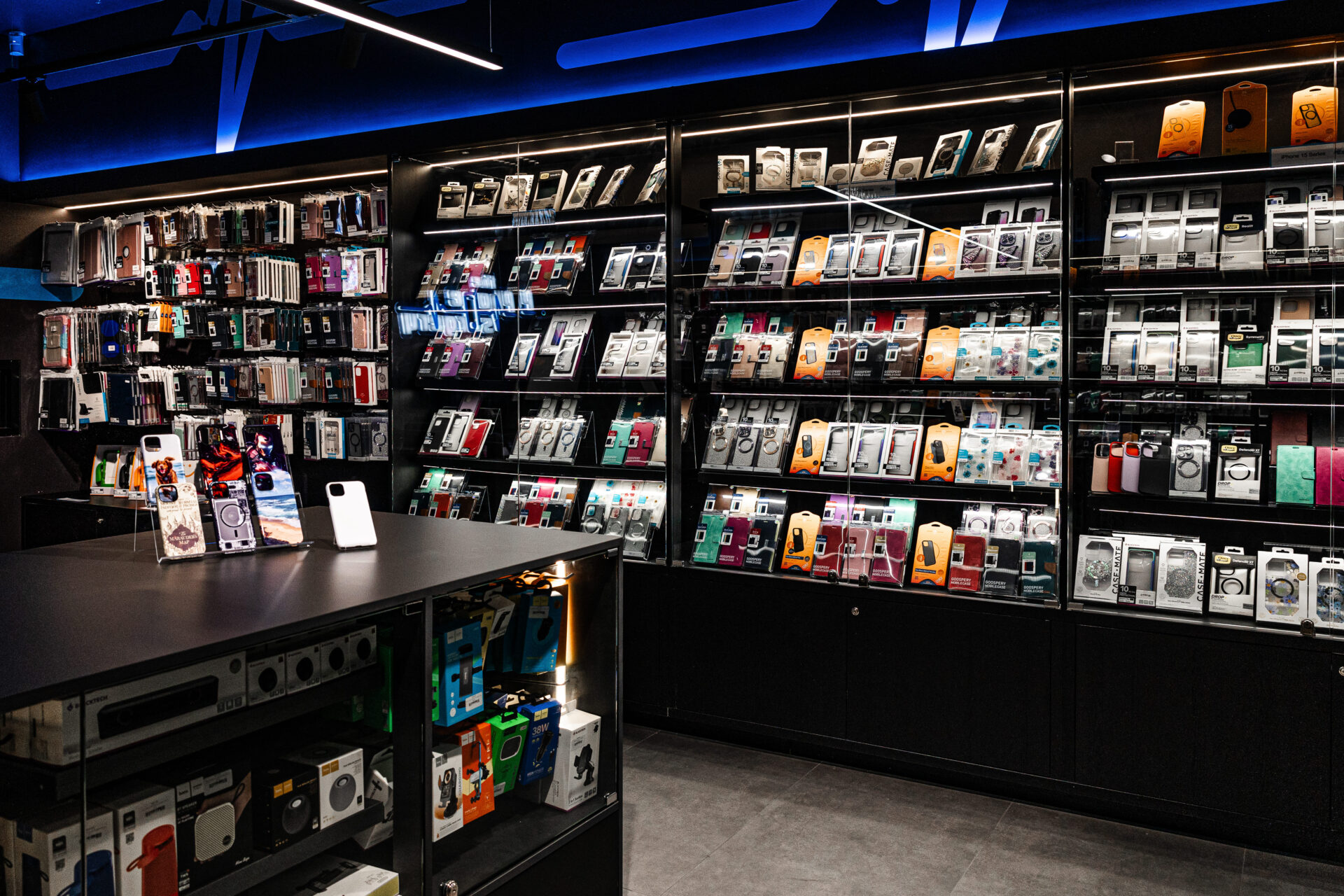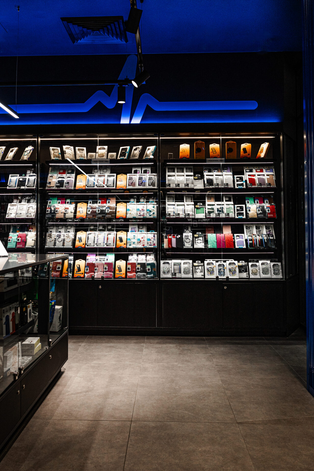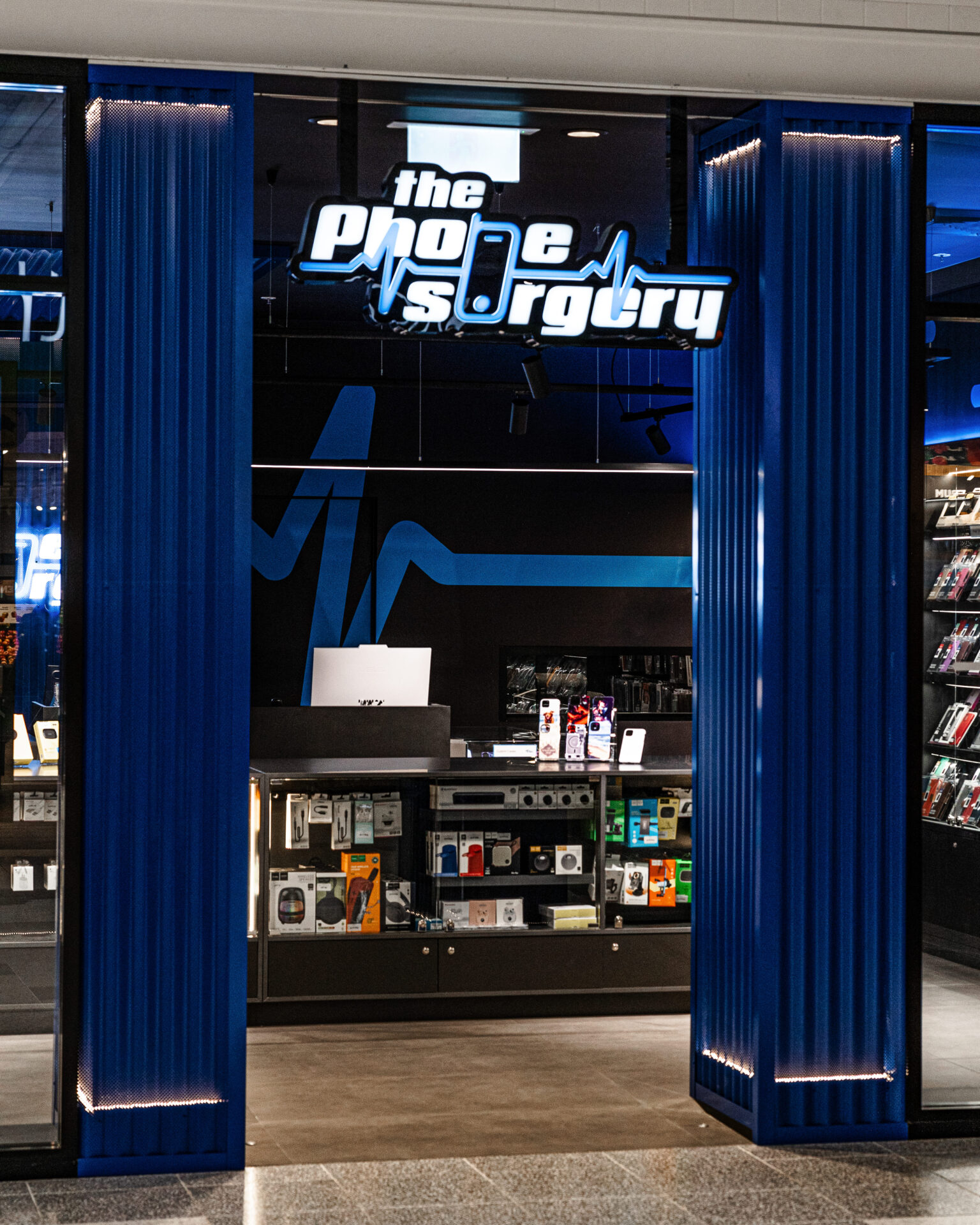 Total Fitouts Illawarra recently completed a cutting-edge commercial retail fitout for The Phone Surgery, a tech repair business owned by Tay and Nikki Esen. Located in the vibrant Kiama Village Shopping Centre, The Phone Surgery specialises in phone, computer, and technology repairs, along with a wide range of phone cases. The Phone Surgery is sleek, modern, and tech-savvy, creating an moody atmosphere that is both professional and inviting.